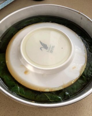 מניחים צלחת קטנה מעל העלים ואז שולחים לתנור לאפייה. צילום עז תלם