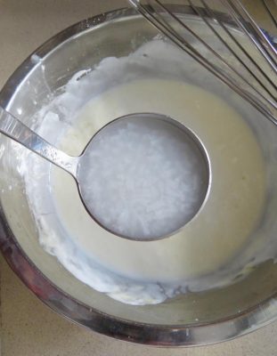 מוסיפים 2-3 מצקות מהאורז המבושל לתערובת הקרה, טורפים היטב תוך כדי הבחישה. צילום עז תלם