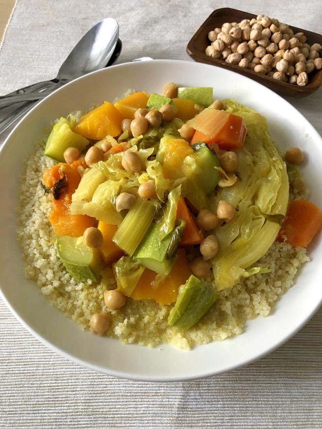 כאשר כל הירקות רכים ויפים אפשר להגיש את המרק, אני אוהב לסדר קוסקוס חם בצלחת, מעליו להניח ירקות ברוחב לב ואז לכסות בנוזלי המרק אבל לא בהגזמה.