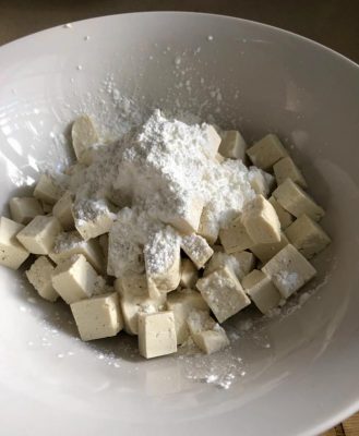 שמים את הקורנפלור על קוביות הטופו. צילום עז תלם