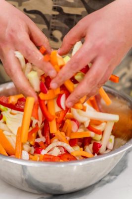 מערבבים היטב כדי שהתיבול יגיע לכל חתיכות הירק. צילום יוסי מויאל