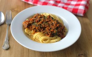 פסטה ברוטב בולונז טבעוני (על בסיס עדשים ופטריות)