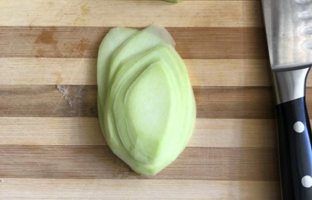 חותכים את הפפאיה לפרוסות דקות (כל פעם מצד אחר). צילום עז תלם