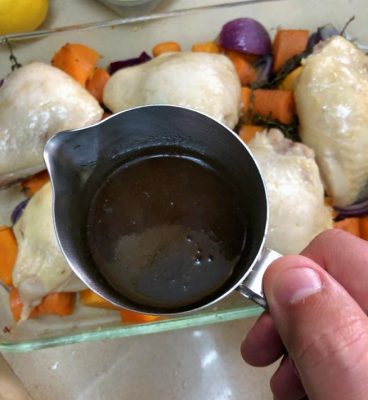 מוזגים את הרוטב מעל העוף ושולחים לסיבוב שני בתנור. צילום עז תלם