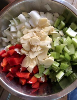 פלפל, בצל, סלרי ושום חתוכים ומוכנים לפעולה. צילום עז תלם