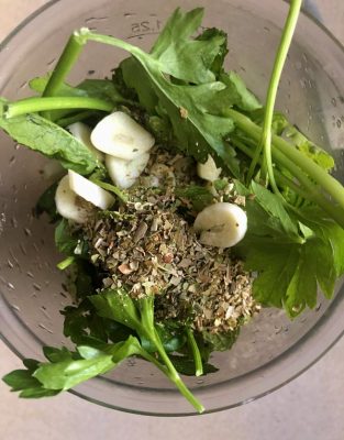 טוחנים את המצרכים למרינדת עשבי תיבול בעזרת בלנדר ידני או בלנדר רגיל. צילום עז תלם