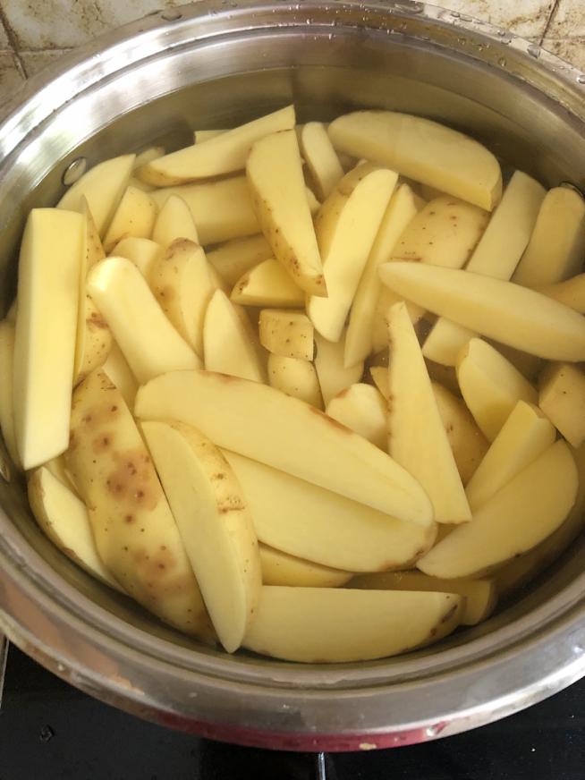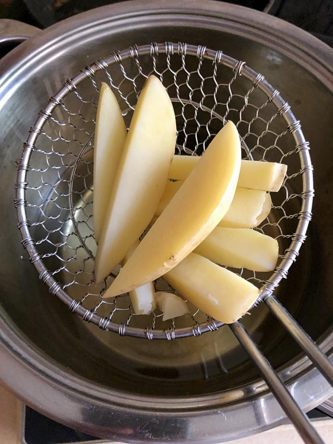 את הבישול הראשוני אני מעדיף לעשות בסיר עם מים רותחים, מה שאפשר הכנה של כמות גדולה יחסית של צ'יפסים והרבה יותר נעים בבית באשר עוד טיגון.