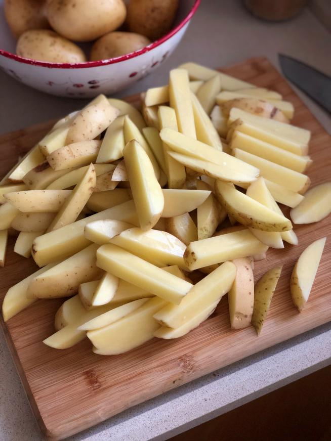 • כשתפוחי האדמה התקררו – אתם יכולים רשמית להפוך אותם לצ'יפס.