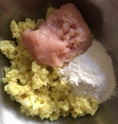 מוסיפים לאורז המבושל קמח וחזה עוף ולשים לבצק דביק טיפה אך לא נדבק. צילום עז תלם