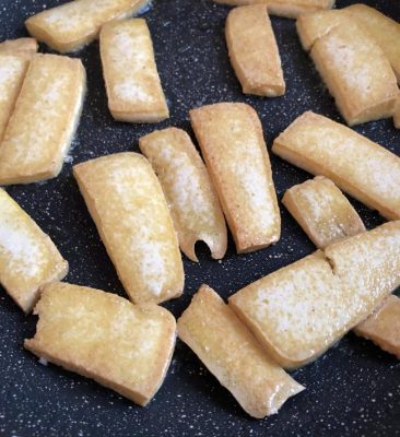 הטופו צריך מינימום 3 דקות במחבת כדי להגיע לצבע הזה. צילום עז תלם