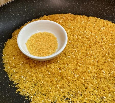 קולים עד שפירורי הלחם זהובים. בקערה – פירורים לפני קלייה. צילום עז תלם