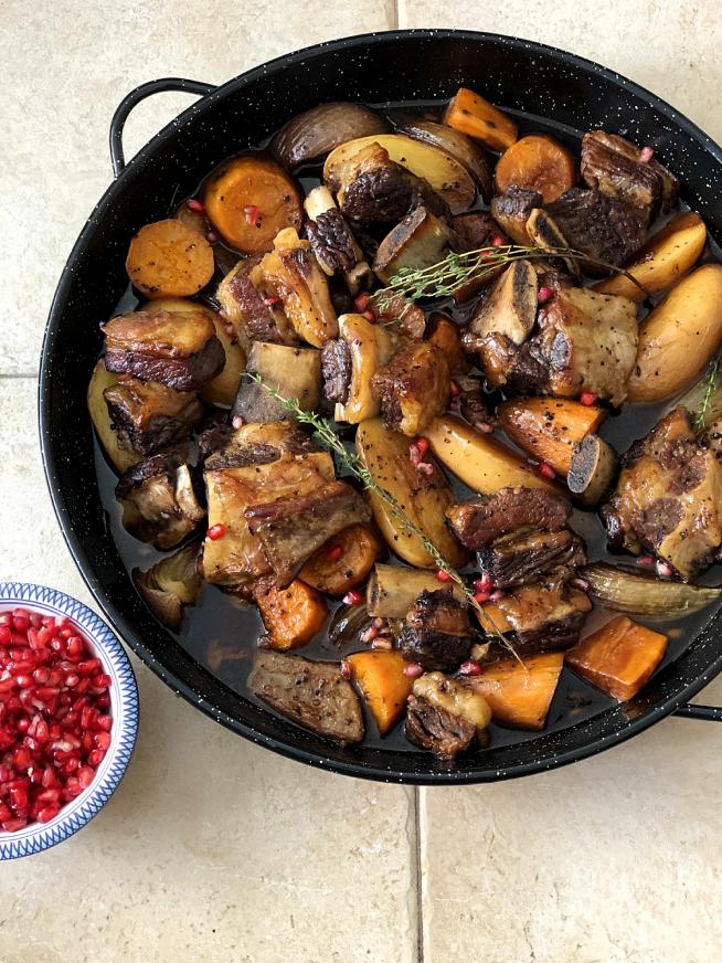 - מכניסים לתנור (150 מעלות) ואופים 2.5-4 שעות או עד שהבשר התרכך לחלוטין והירקות התבשלו.