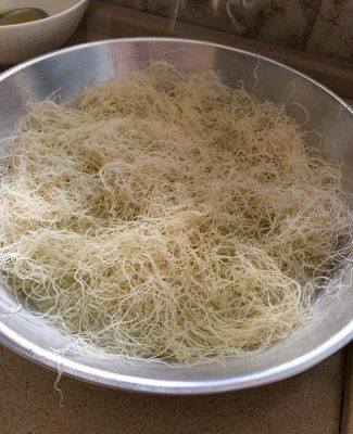 שמים שכבת אטריות קדאיף מעל החמאה. צילום עז תלם