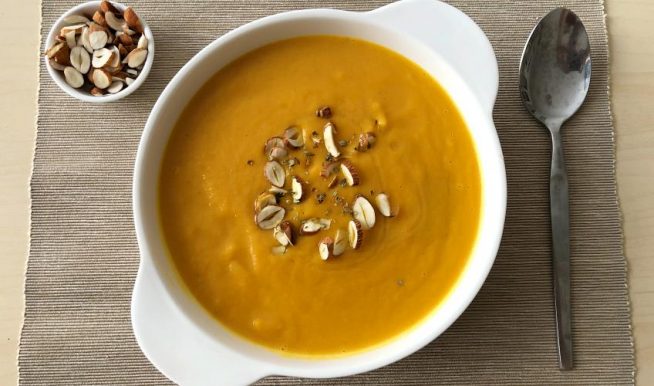 מרק עדשים כתומות ודלורית בקארי ביתי וקרם קוקוס