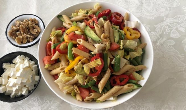 סלט פסטה מעולה לכל סעודה (ומתאים גם בתור ארוחה קלה לעבודה) עם המון ירקות, גבינה בולגרית ואגוזי מלך, ברוטב דבש חרדל בלסמי נהדר ומלא טעמים